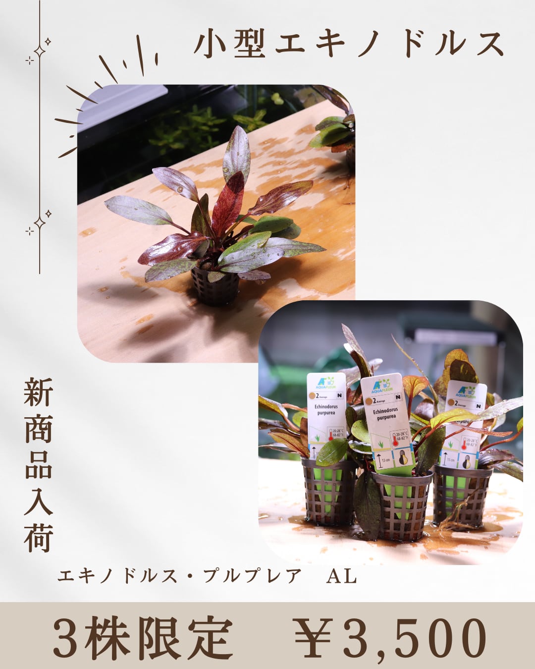 エキノドルス・プルプレアは、ワインレッドの葉に赤紫の斑が入る、存在感のある人気種です。